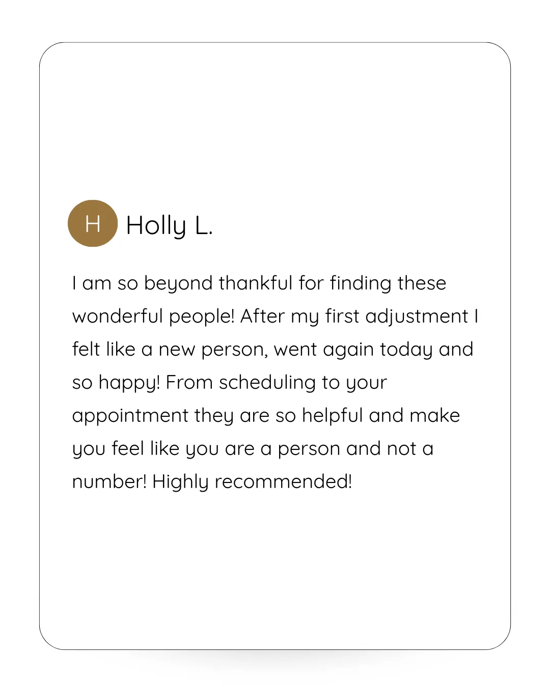 Every person is different, but many patients begin noticing improvements in mobility, tension, sleep, or overall comfort within the first few visits. Lasting change happens through consistency, because chiropractic care focuses on restoring proper function and supporting your nervous system over time. Your care plan will be personalized to your goals and lifestyle, and we’ll guide you every step of the way so you can experience steady, sustainable progress — not just temporary relief.